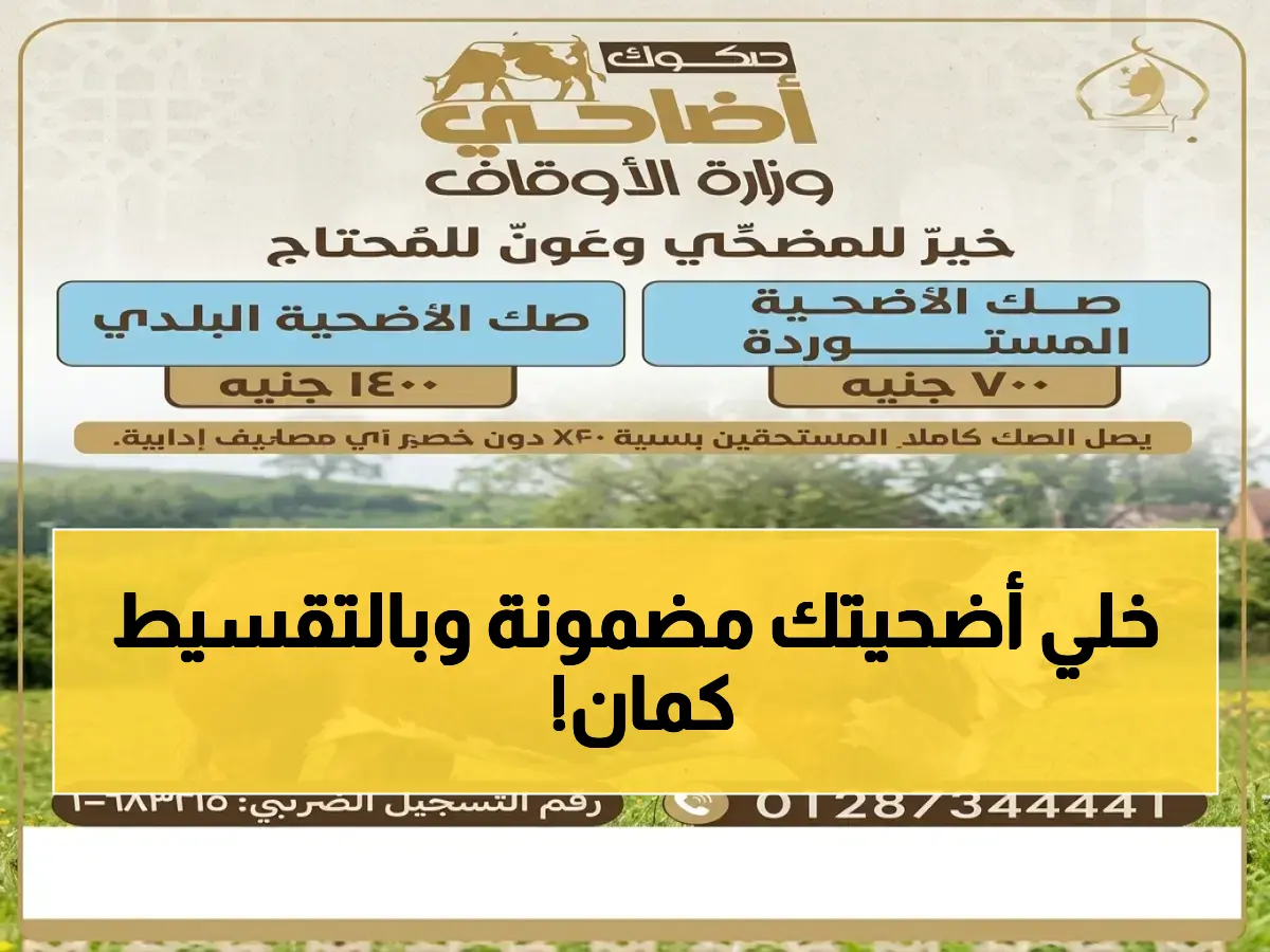 - وزارة الأوقاف: يمكن السداد كاش أو بالتقسيط على 6 أشهر عبر تطبيق مصر الرقمية. يحصل المشترك على 7 كيلو لحوم.