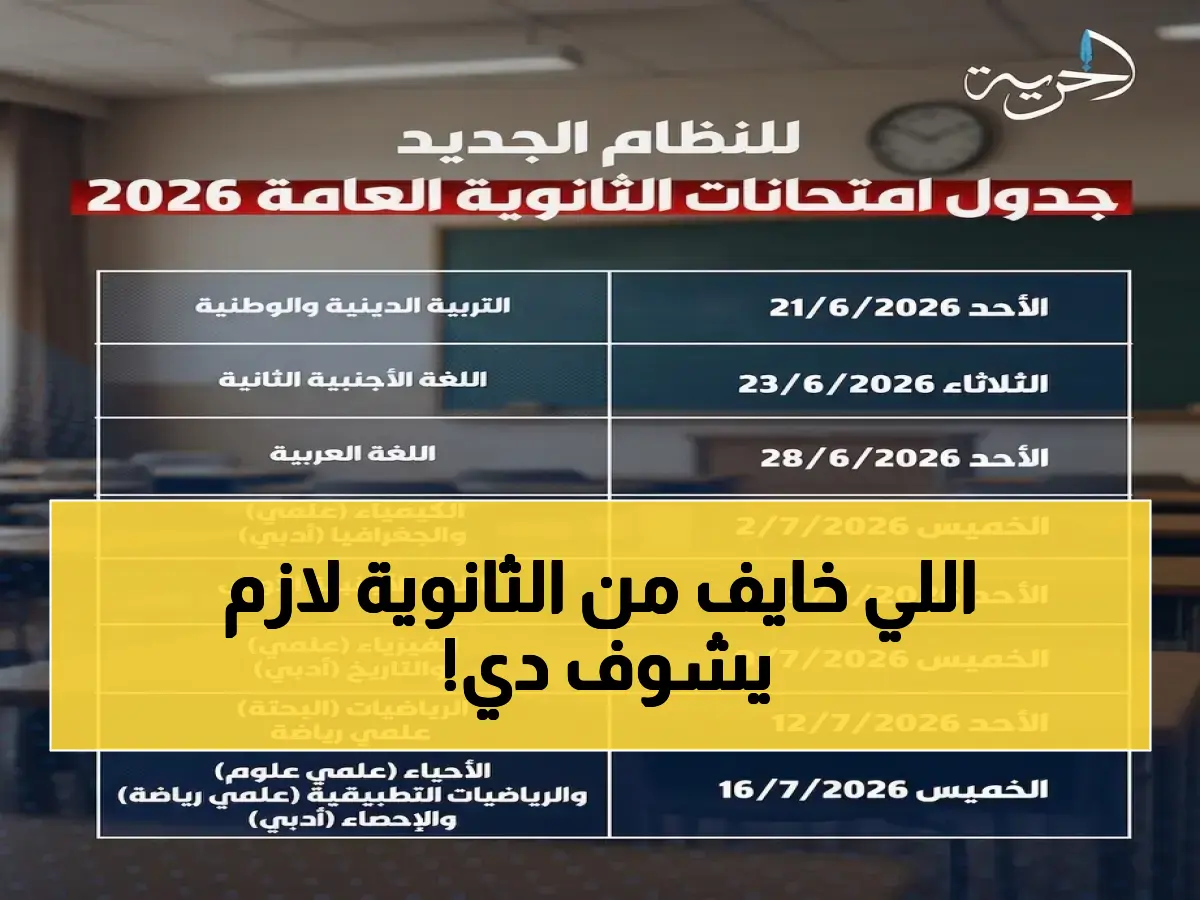 الموعد الخطير الذي ينتظره مئات الآلاف من الطلاب المصريين هو 21 يونيو 2026. هذا هو اليوم الذي سيشرع فيه امتحانات الثانوية العامة للعام الدراسي 2025/2026، بحسب الجدول الذي أعلنت عنه وزارة التربية والتعليم والتعليم الفني.