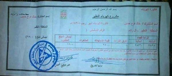 وبحسب الصورة فأن مبلغ 2500 ريال هو الحد الأدنى مقابل إستهلاك 8 كيلو وات حيث تبيع الحكومة اليمنية الكيلو بسعر 7 ريال للمواطنين وتفرض الحد الأدنى 300 ريال بينما يفرض عبدالملك الحوثي 2500 ريال كحد ادنى حتى لو كان الإستهلاك صفر.