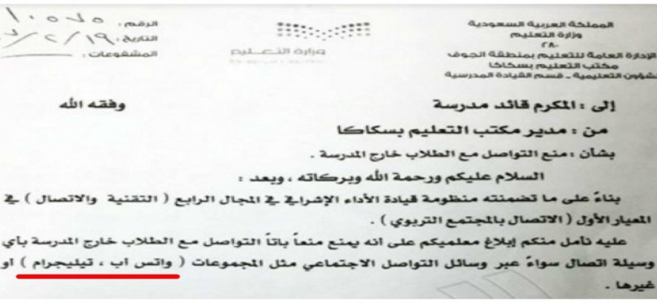 وأصدرت وزارة التعليم السعودية، تعميماً تحظر عبره التواصل بين المعلمين والطلبة خارج المدرسة عبر شبكات وتطبيقات التواصل الاجتماعي مثل "واتساب" و"تيلغرام".