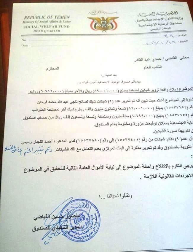 وتفيد الوثيقة أن المدعو أحمد النجار، مندوب ما يسمى باللجنة الثورية التابعة لجماعة الحوثي، في صندوق الرعاية الاجتماعية، أقدم على اختلاس مبالغ مالية ضخمة وصلت إلى 100,000,000 ريال مائة مليون ريال يمني، خلال أسبوعين فقط.