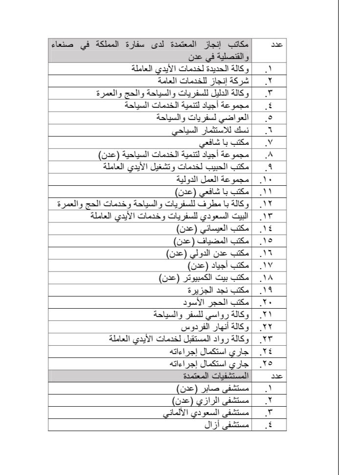 نشر السفير السعودي لدى اليمن على حسابه في موقع التواصل الإجتماعي تويتر قائمة بأسماء المكاتب المعتمدة لبدء معاملات تأشيرات الدخول إلى المملكة والتي قال انها ستبدأ من اليوم السبت بإستقبال المعاملات.